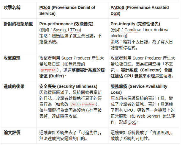 - Rethinking Provenance Completeness with a Learning-Based Linux Scheduler:這篇論文的作者群(Jinsong Mao, Shiqing Ma 等人)認為 NODROP 雖然提出了資源隔離,但有兩大缺陷: