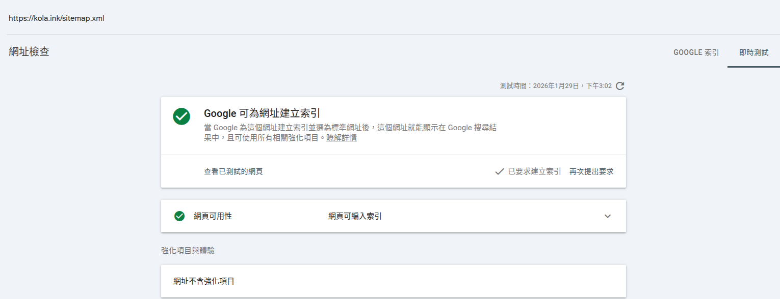 發現要去 Google Search Console 註冊,放上自己 Sitemap.xml 的網站給它讀,但在給它讀的時後會發現一直有錯誤,如圖。
