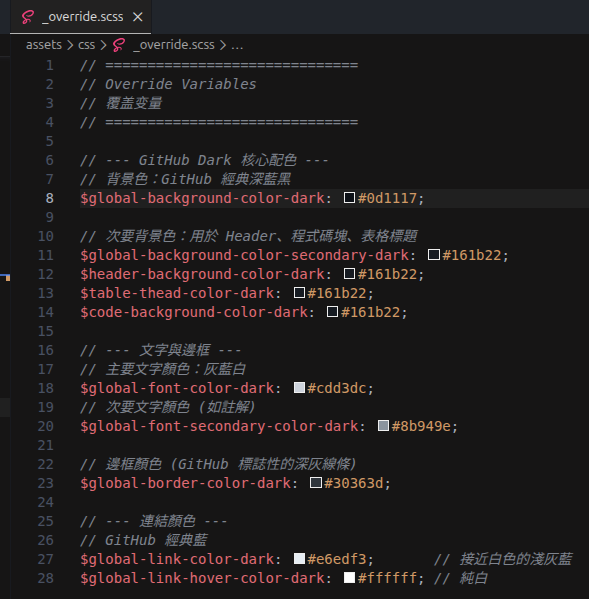 有 _overrid.scss 可以讓你替換顏色,像是我覺的 Dark mode 顏色很丑,我就用 $global-background-color-dark 替換了不同顏色。